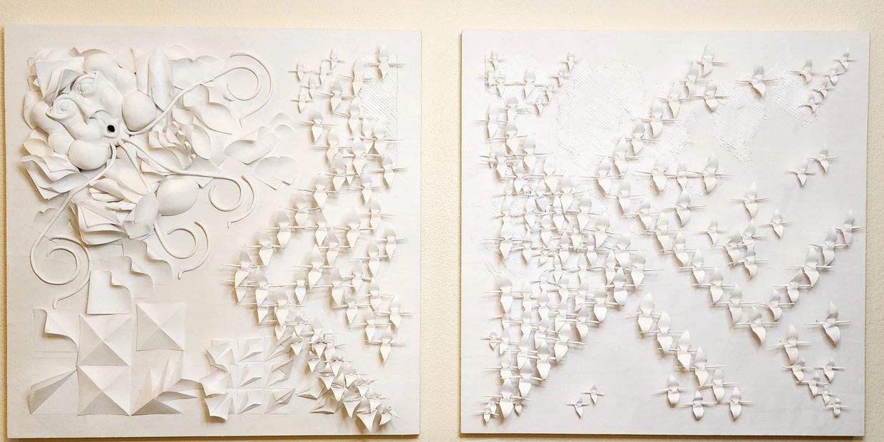 Origami cranes and paper clay with white gouache. 100% acid free paper and wood birch boards, 1" thick board which is overall 3 1/2" thick including frame.