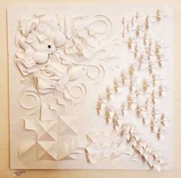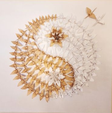 I've incorporated several designs that are a combination of origami cranes and paper clay with white gouache in this series. It's all 100% acid free so it will stand the test of time. The technique that I use when placing origami cranes creates shadows which give a three-dimensional feel to each piece and lighting can enhance display. My artwork is placed on a birch wood board that is ready to hang on your wall. These pieces I've been told look really special on a spacious wall in your home or office. It can definitely spark conversation for any enthusiast!