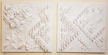 Origami cranes and paper clay with white gouache. 100% acid free paper and wood birch boards, 1" thick board which is overall 3 1/2" thick including frame.